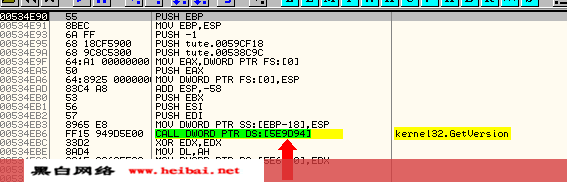 CALL [xxxxxx] 或者 JMP [xxxxxx] 间接地带有它们即将跳往IAT中某处的内存地址值.在这张图中,我们可以看到 CALL [5e9d94]. 那意味着这个call将要前往这个内存地址,实际上就是IAT表的入口值.在它的右边我们可以看到"kernel32.Getversion" (黄色). 这就意味着这是一个可以在IMPORT RECONTRUCTOR上被找到的正确的入口值.